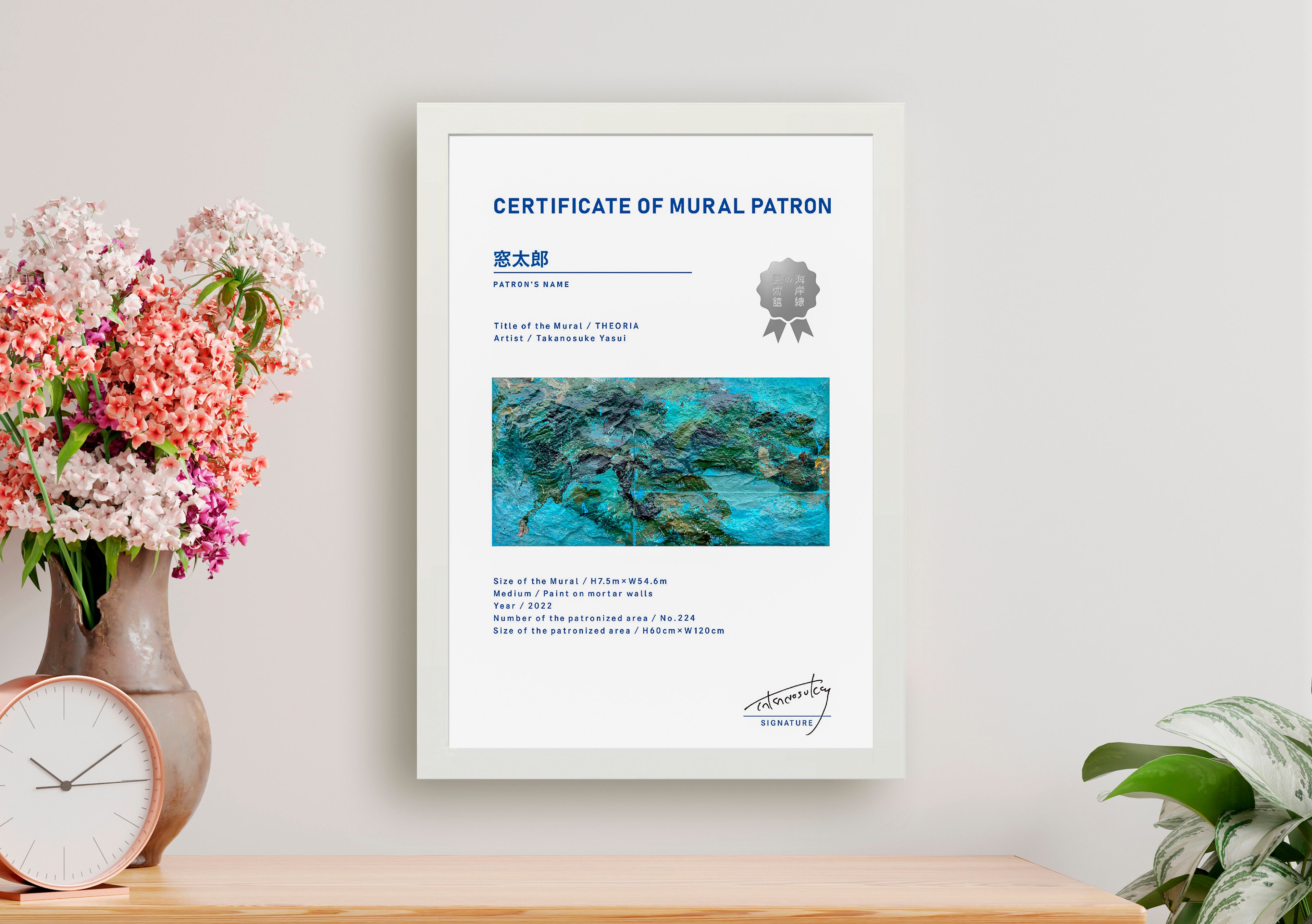 壁画コレクションからお好きな部分をお選びいただき、パトロンの証明として証明書を紙で発行します。実際の壁画は経年や環境などで色彩や表情が変化していきますが、証明書は完成当時の色彩のままなので、その変化・差をお楽しみいただけます。